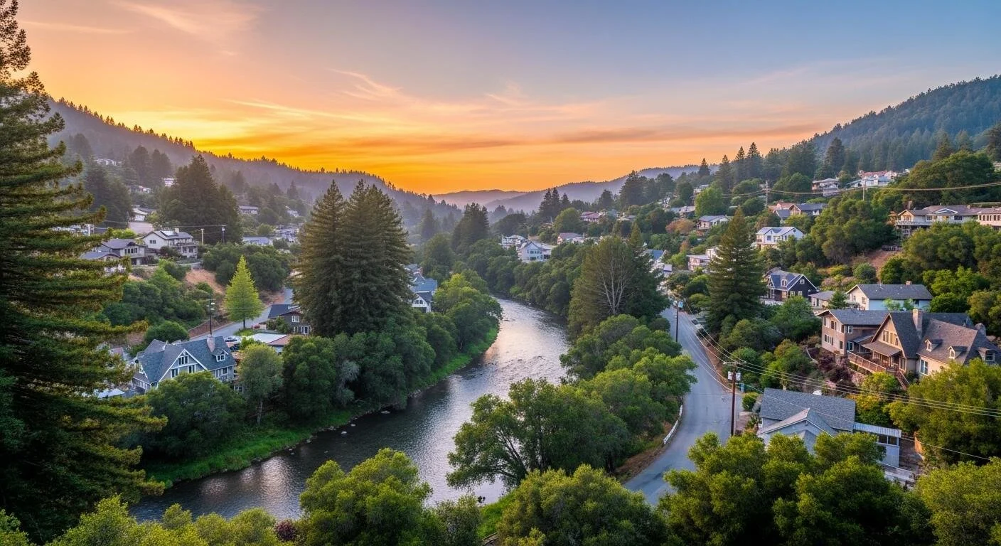 Golden sunset light over the San Lorenzo River winding through Ben Lomond in the Santa Cruz Mountains, where forested hillsides and cozy mountain homes create the peaceful charm of redwood mountain living. Photo credit: nextdoor.com